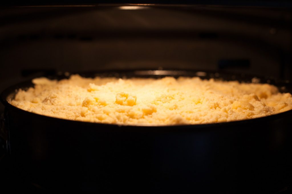 Aus Mehl, Zucker und der Butter die Streusel fertigen und über die Johannesbeeren geben.