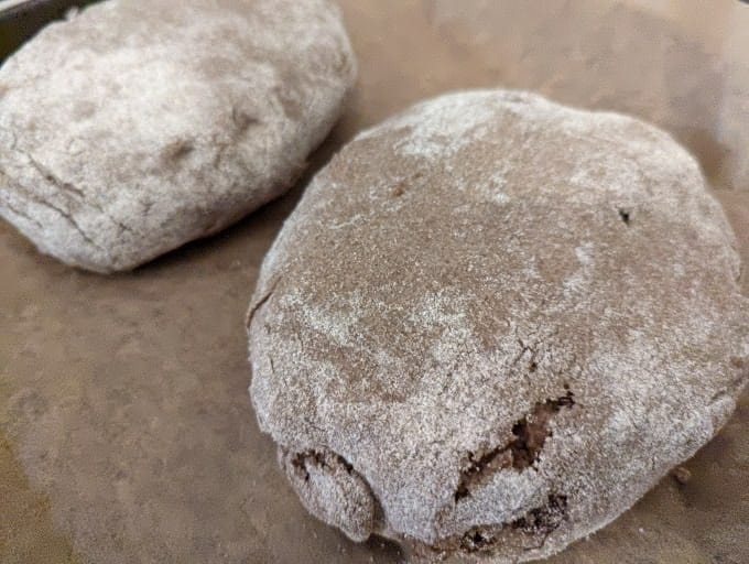 Für die Brotrinde 3 Hände Teig jeweils mit Mehl ausrollen und zur Seite stellen. Den restlichen Teig in drei Teile Teilen.