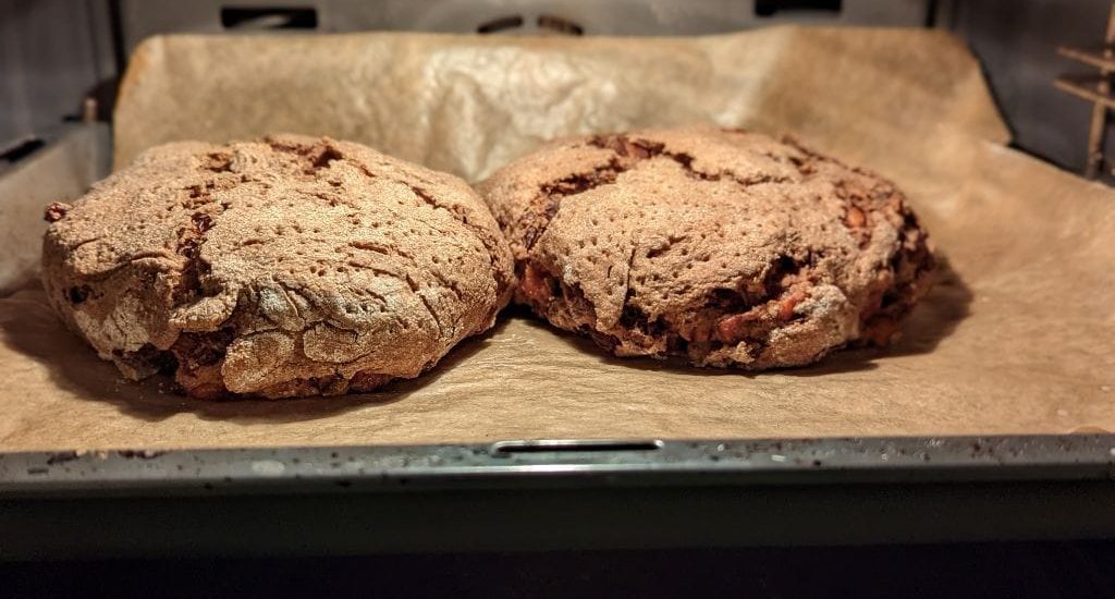 Die Brote werden bei 150 Grad 70 Min. im Ofen backen. Ein fertiges Brot klingt hohl, wenn man drauf klopft.