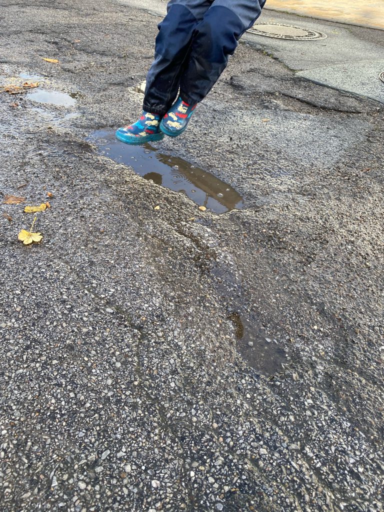 Ätzendes Wetter draußen…kein Mensch traut sich vor die Tür. Keine Ahnung wo plötzlich die ungeahnte Energie her kommt, jedenfalls schnappe ich mir meinen Jüngsten, für den das „Pfützen“ schon zum geflügelten Wort geworden ist. Denn der Kindergärtnerin hat er bereits stolz von dieser Tätigkeit des Pfützen-Springens erzählt. Ich wittere ein einmaliges gemeinsames Erlebnis, einen Um-die-Ecke-Urlaub oder ein Mikroabenteuer vor der Haustür. Wir schlüpfen also in die immer beliebten „Gummipiefel“ und in den Matschanzug und ab geht es: nach draußen, wo es zum Glück auch nur noch fieselt.