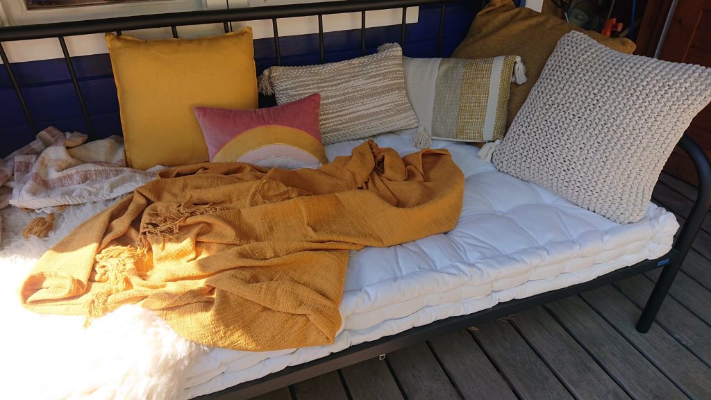 Das Gartenbett aus meiner Tagträumerei kann schon angefasst werden, tada! Ich überlege noch, ob ich es wirklich gelb lackieren soll (oder vielleicht eher weiß?) oder ob es einfach so bleiben kann. Man kann darauf auch so schon super im Garten dösen, Gutenachtgeschichten vorlesen, Pläne schmieden und Podcasts hören.